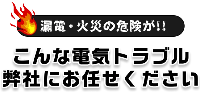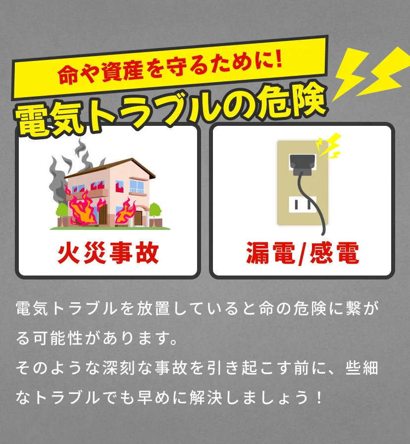 漏電・火災の危険がある電気トラブル。ブレーカー/漏電、コンセント、スイッチ、照明のトラブルに対応。ブレーカーが落ちる、差しても点かない、スイッチが反応しない、チカチカ点滅するなどの問題に対応。