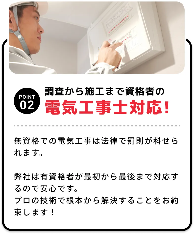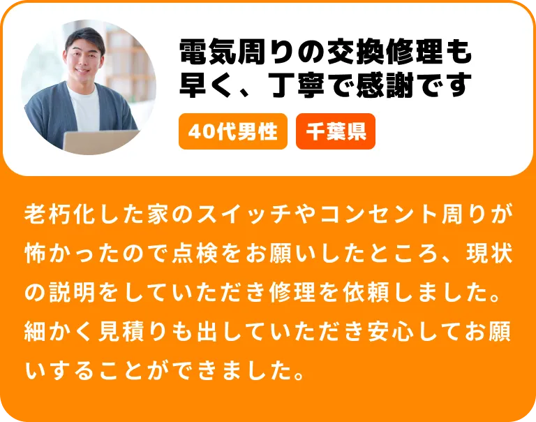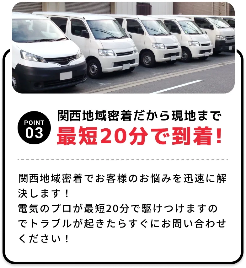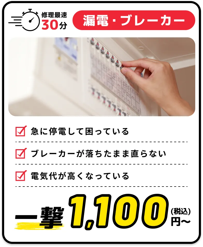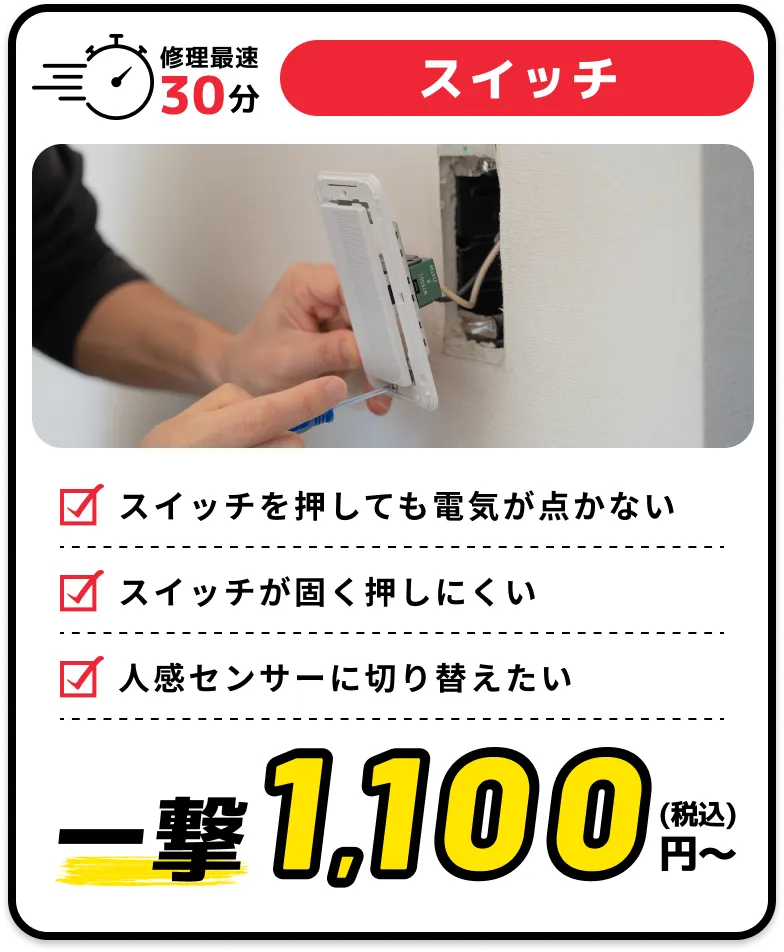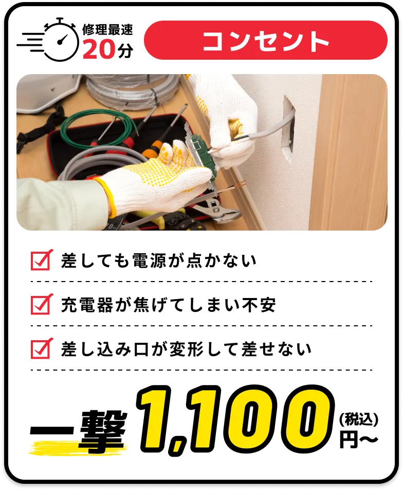 コンセント、スイッチ、照明、ブレーカーの対応。WEB限定価格1100円から。関東地域最短20分で駆けつけ。電気工事士対応で安心。施工実績3万件、出張・見積り無料、受付時間24時間365日。