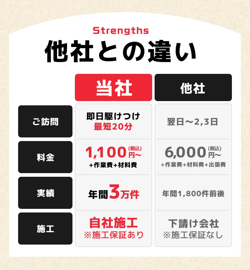 当社では保険への加入、無料の保証制度、3日以内の再発は無料修理を導入しています。